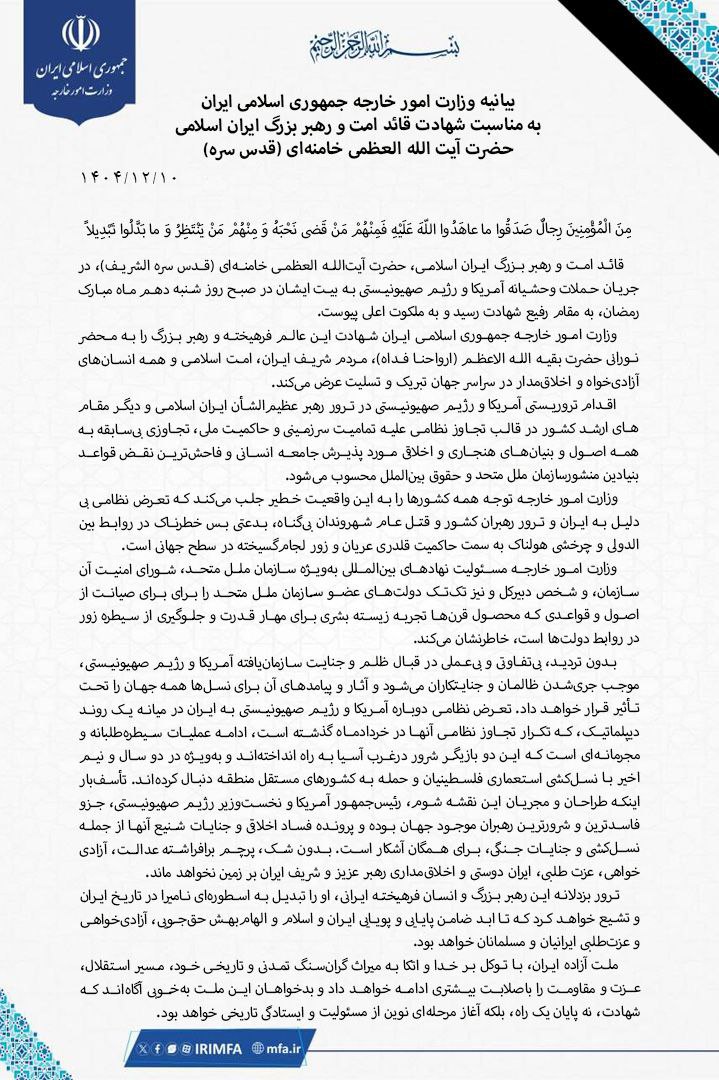 بیانیه وزرات امور خارجه جمهوری اسلامی ایران به مناسبت شهادت قائد امت و رهبر بزرگ ایران اسلامی، حضرت آیتالله العظمی #امام_خامنهای (قدّس سرّه الشّریف)